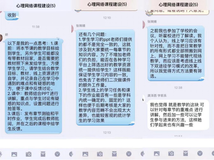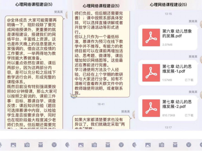 2020年2月12日至13日,学前儿童心理与发展课程组按照校、系“停课不停学”的工作要求,针对网络授课开展线上教研活动。本次教研由樊高英老师主持,将于本学年第二学期任教的陈云娇、陈玥如、龚泽西、张琬婧四位老师参与讨论。