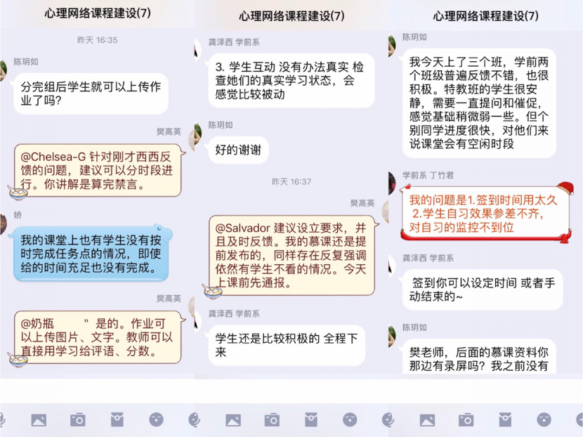 陈玥如老师则反映,课程中学生提到的最多的是需要在章节页面与群聊页面来回切换,操作不便。此外,因学生学习快慢不一,整体进度难以掌握。同时存在缺旷情况。