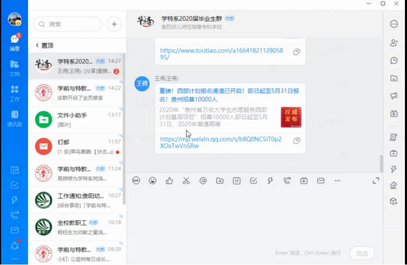 为应对当前严峻的就业形势,给应届毕业生提供就业指导与帮助,2020年4月17日下午14:30,学前与特殊教育系通过钉钉在线直播举办了2020届毕业生毕业、就业指导工作会议。学特系书记刘世勇老师、副主任赵俊老师、学生科负责人杨宇老师、教务科负责人王佣老师、2020届毕业班辅导员以及2020届毕业班全体学生参加会议。