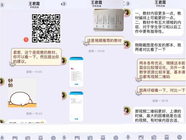 由于整体构架不符合国内幼儿园一线实践情况,《儿童观察——实践操作指南》被首先被排出。其次,樊老师和张老师均认为《幼儿观察与评估》以普通心理中的感知、思维等心里过程为线索介绍观察,不利于学生的实践运用。还容易让学生将原本完整心理过程彼此割裂。剩下的三本教材均以幼儿园一日生活各环节为线索介绍儿童观察的理论知识与实践应用。但由于陈云娇老师推荐的华东师大出版社,侯素雯、林健华主编的《幼儿行为观察与指导这样做》没有样书。因而具体比较主要针对华师大的《学前儿童行为观察》与湖师大的《学前儿童行为观察与指导》。由于前者偏向理论与科研,后者则相对更符合我校学生特点,并且具有大量视频资源。因而将以后者为学生教材,前者则作为教师用书使用。