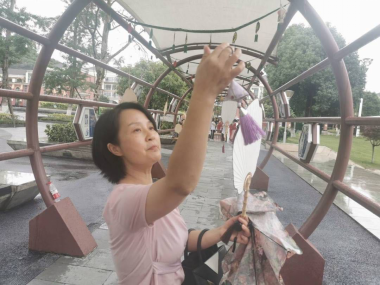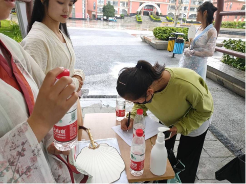 蒲葵扇俗称蒲扇,由蒲葵的叶、柄制成,是中国应用最为普及的扇子,亦称“葵扇”。师生从长廊中取下中式古典空白蒲扇,手工绘制夏日创意图案后,炎夏可用来扇风,得一份清凉。