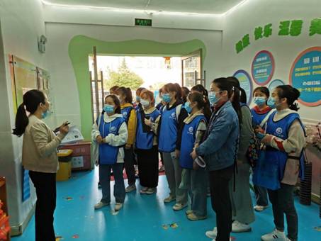 健康扫码进入幼儿园后,实习生们得到了幼儿园班园长的热情接待。沿着园舍楼道,班园长介绍了疫情期间幼儿园的特殊房舍和管理,让同学们对幼儿园疫情防控有了直接的认识。