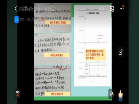 在实习生层面,曾老师从实习手册填写、实习前物质和心理准备、实习管理要求等方面,给出建议并提出要求,希望同学们调整心态、规范个人言行、怀揣专业实习目的进入园所实习;在实习委员或大组长层面,曾老师从班干部管理能力提升和工作内容开展的角度提出工作要求,期望同学们积极主动,做好校内指导教师、实习园所和同学们的沟通和事务服务工作;在指导教师层面,曾荣老师与指导教师共同梳理工作流程,重点解读学生实习手册中指导教师评语与指导教师工作记录的填写注意事项,并给出工作建议。