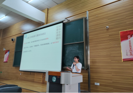 首先,学姐分享实习常规要求。2021级同学孙露平和龚淑婷作为校外实习“过来人”,以实习中常见的困惑导入,从“实习前的准备、实习中的学习要求和建议及实习后的资料要求”三个方面,特别强调学校在实习纪律、着装、安全和请假等方面的要求,温馨提示第一次外出实习的学弟学妹们需遵守规定、安全实习。